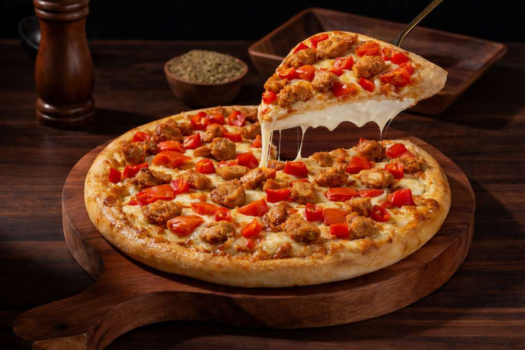 Rich cheese burst crust topped with smoky tandoori chicken tikka, tomato, red paprika, and signature tandoori sauce for bold flavor.
