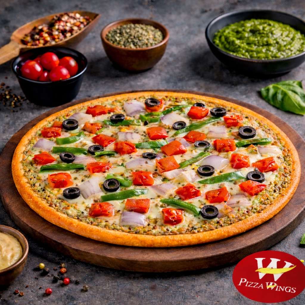 Crispy thin crust topped with fresh veggies, rich pesto sauce, and melted cheese, baked light, flavorful, and perfectly balanced for every bite.